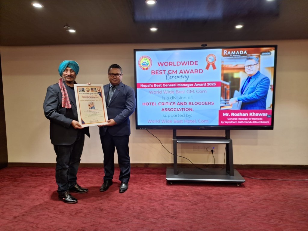 In a grand and prestigious recognition ceremony held in Kathmandu, Mr. Roshan Khawas, General Manager of Hotel Ramada by Wyndham Kathmandu Dhumbarahi, was officially conferred with the “Nepal’s Best General Manager Award 2025” by Mr. Tajinder P. Grover, President of the “Hotel Critics & Bloggers Association” (Team HCBA) and Chairman of “Worldwide Best GM” and “Worldwide Best Hotel”.